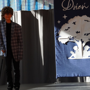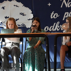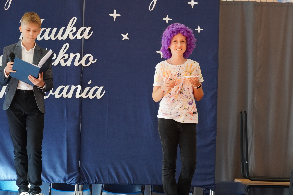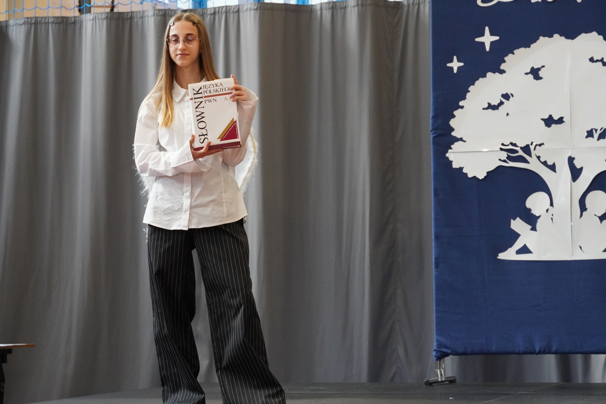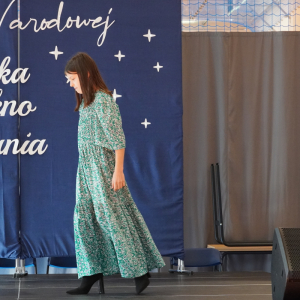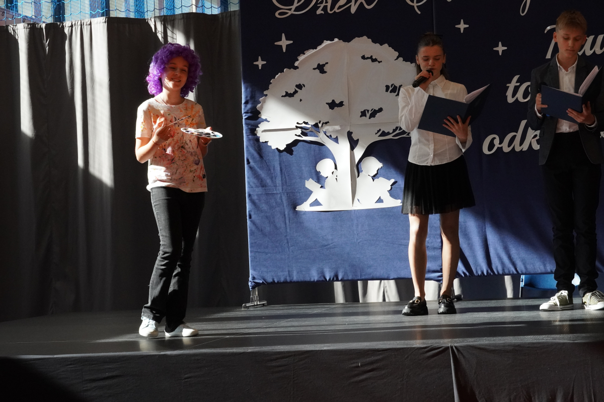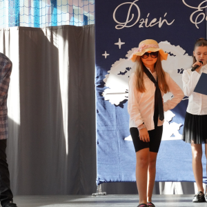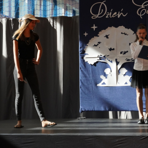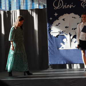 Kolejnym punktem programu był humorystyczny pokaz mody nauczycielskiej, który wywołał wiele uśmiechów na twarzach zebranych. Stroje zostały zaprezentowane z dużym dystansem i poczuciem humoru – od klasycznego „belfra” po „nauczyciela WF-u w stroju sportowym”. Szczególną atrakcją była także scenka teatralna, w której uczennice klasy V wcieliły się w rolę nauczycielek, rozmawiając o codziennych trudnościach i wyzwaniach związanych z pracą w szkole. Ich występ był zabawny, a jednocześnie pełen empatii i zrozumienia dla pracy pedagogicznej.