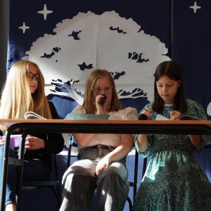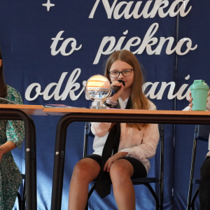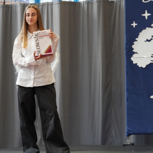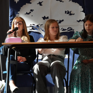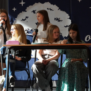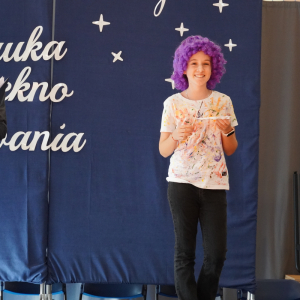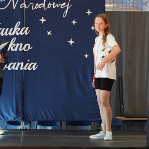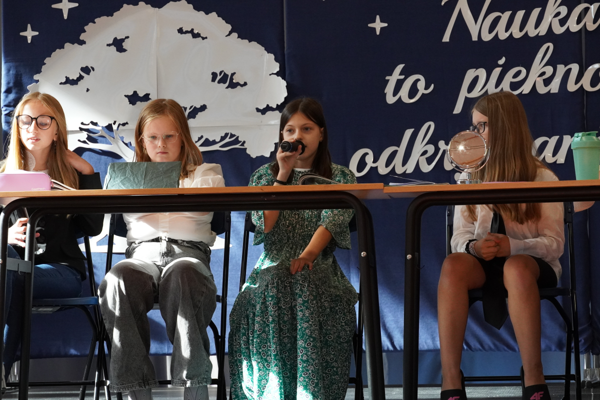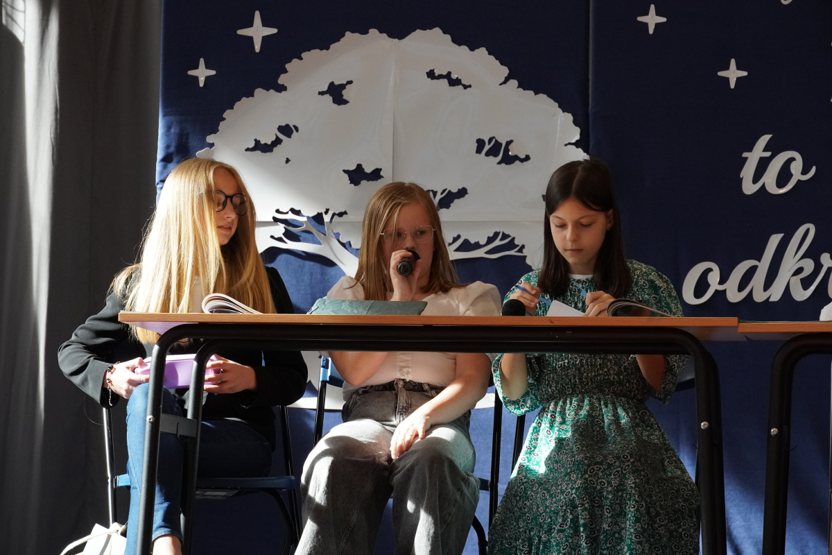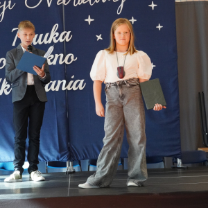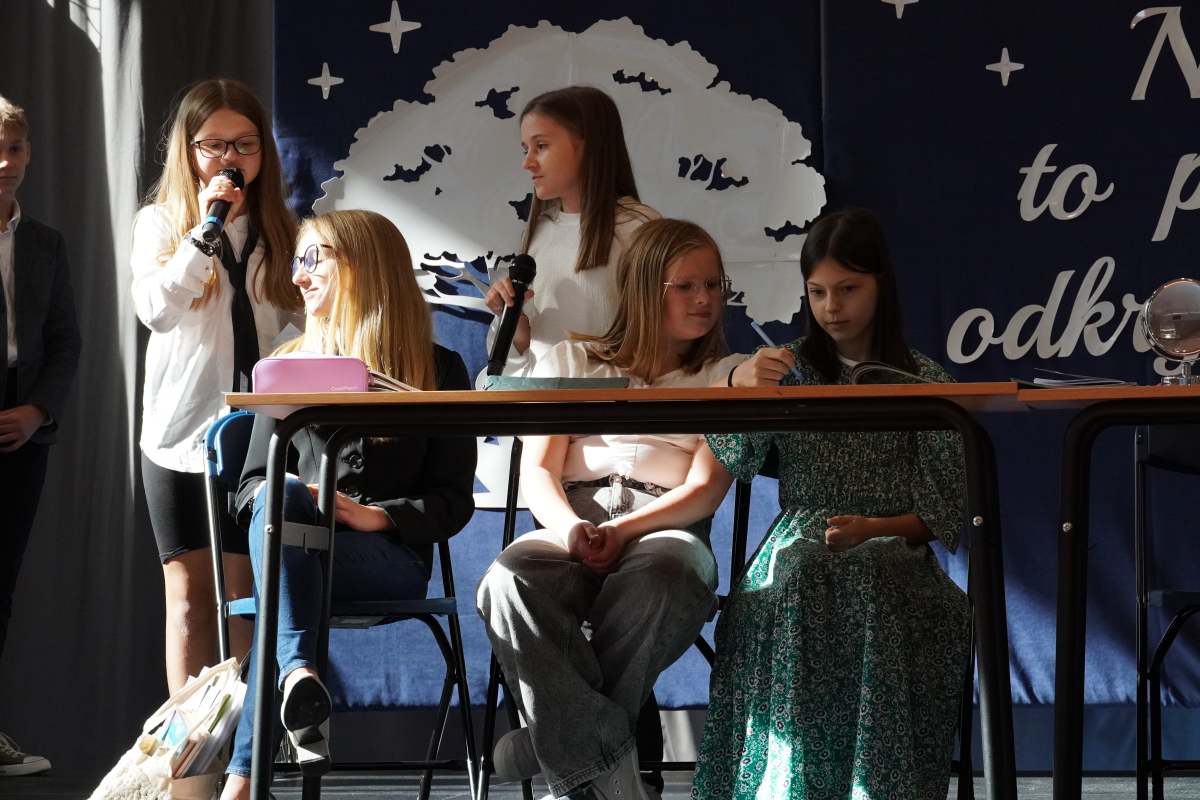 Kolejnym punktem programu był humorystyczny pokaz mody nauczycielskiej, który wywołał wiele uśmiechów na twarzach zebranych. Stroje zostały zaprezentowane z dużym dystansem i poczuciem humoru – od klasycznego „belfra” po „nauczyciela WF-u w stroju sportowym”. Szczególną atrakcją była także scenka teatralna, w której uczennice klasy V wcieliły się w rolę nauczycielek, rozmawiając o codziennych trudnościach i wyzwaniach związanych z pracą w szkole. Ich występ był zabawny, a jednocześnie pełen empatii i zrozumienia dla pracy pedagogicznej.