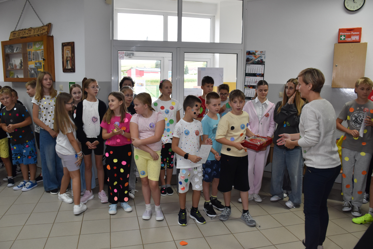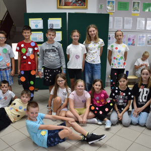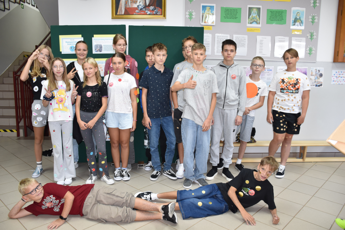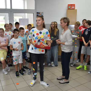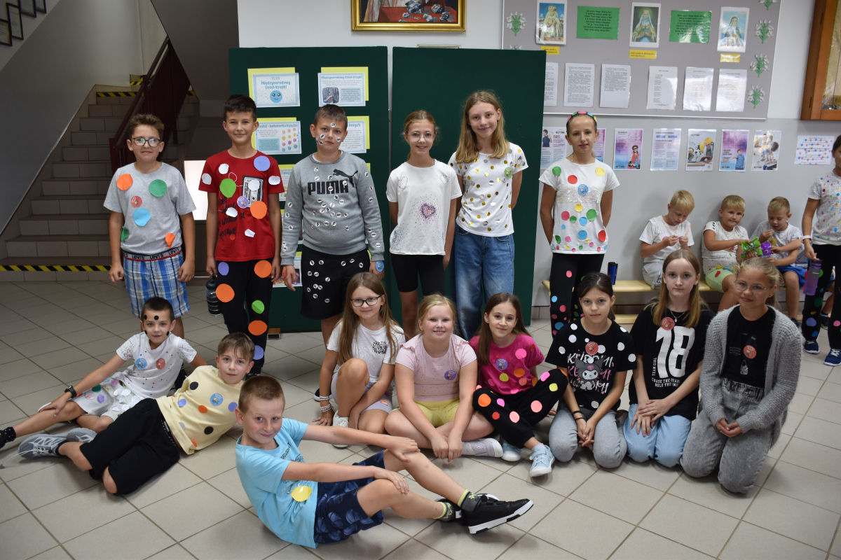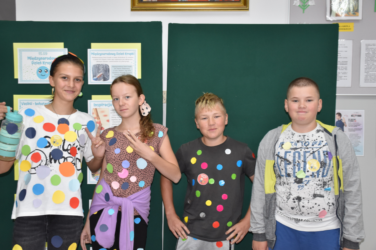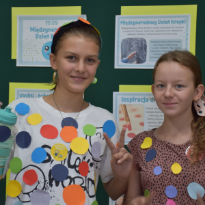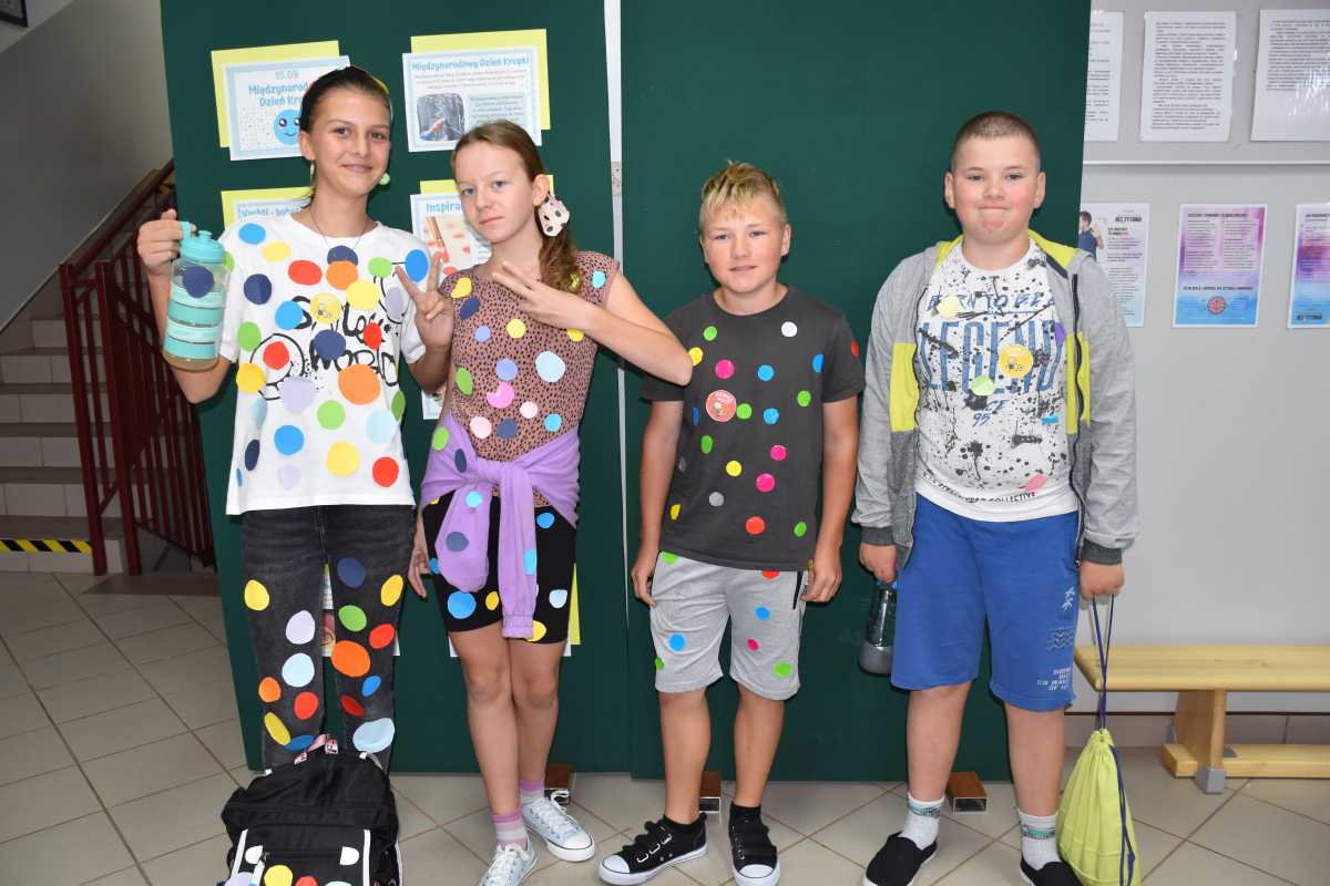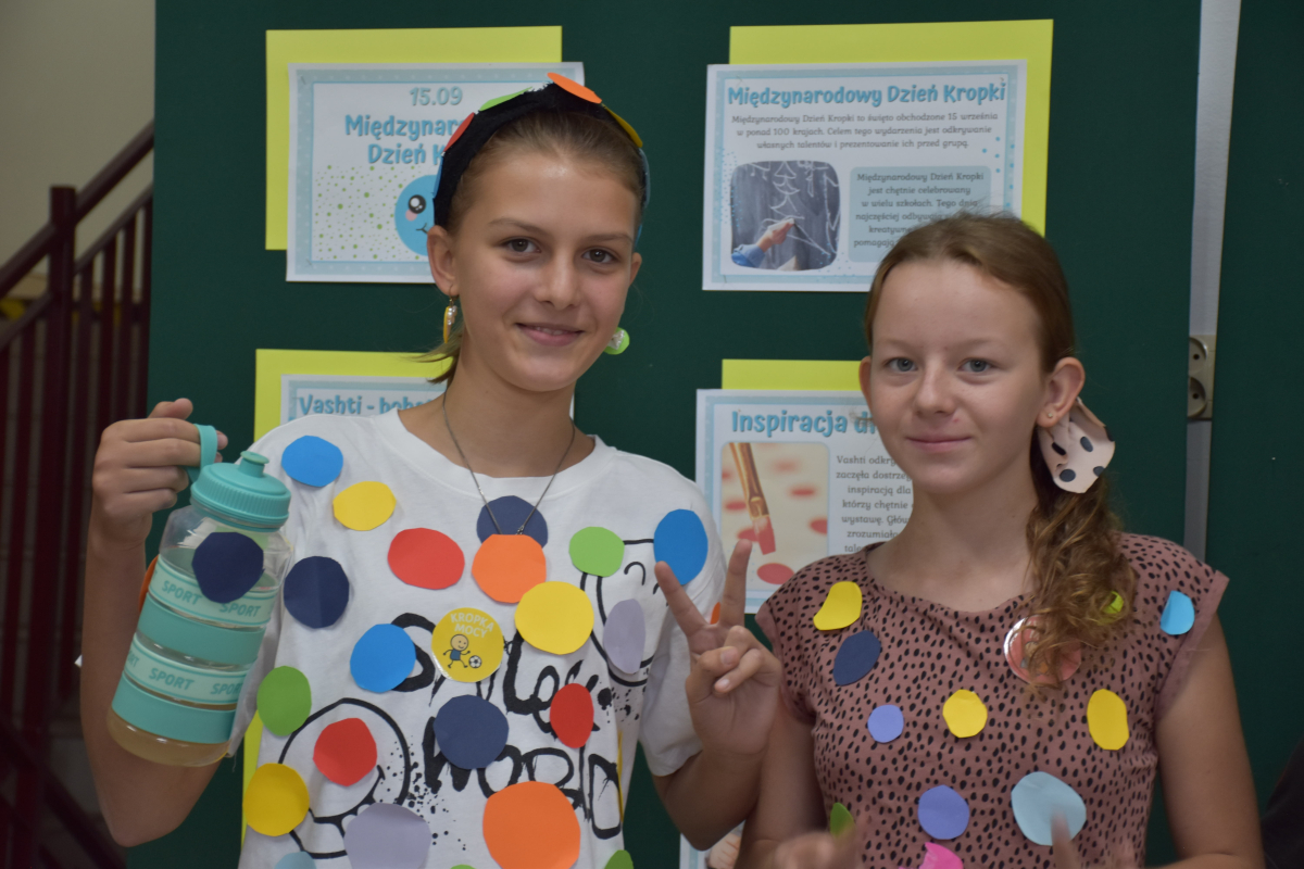 W piątek 19 września w naszej szkole Samorząd Uczniowski zorganizował obchody Międzynarodowego Dnia Kropki – Dzień Kropki Mocy. Celem tego wydarzenia było odkrywanie własnych talentów i zachęcanie do zaprezentowanie ich przed grupą. Inspiracją do stworzenia tego wydarzenia stała się Vashti, czyli bohaterka książki "The Dot"(autor: Peter H. Reyolds). Vashti nie wierzyła w swoje zdolności plastyczne. Jej nauczycielka plastyki wychwyciła talent dziewczynki malowanie pięknych kropek. Główna bohaterka - odpowiednio zmotywowana zaczęła malować nowe obrazki, a nawet tworzyć wystawy w galeriach sztuki! Vashti odkrywając swój talent, zaczęła dostrzegać, że stała się inspiracją dla wielu ludzi, którzy chętnie odwiedzili jej wystawę. Główna bohaterka zrozumiała, że wyjątkowe talenty drzemią w każdym człowieku i zaczęła zauważać je także u innych. W tym dniu uczniowie naszej szkoły zaprezentowali makijaże, stroje z elementami kropek. Z wielkim zaangażowaniem włączyli się do akcji. Najbardziej udekorowani uczniowie otrzymali bon zwalniający z odpowiedzi ustnej, ważny do końca września, natomiast klasy najbardziej wykropkowane otrzymały smakołyki. W tym dniu uczniowie mogli również zakupić przygotowane słodkości. Bardzo wszystkim dziękujemy za tak wielkie zaangażowanie i zachęcamy do udziału w kolejnych akcjach Samorządu Uczniowskiego!