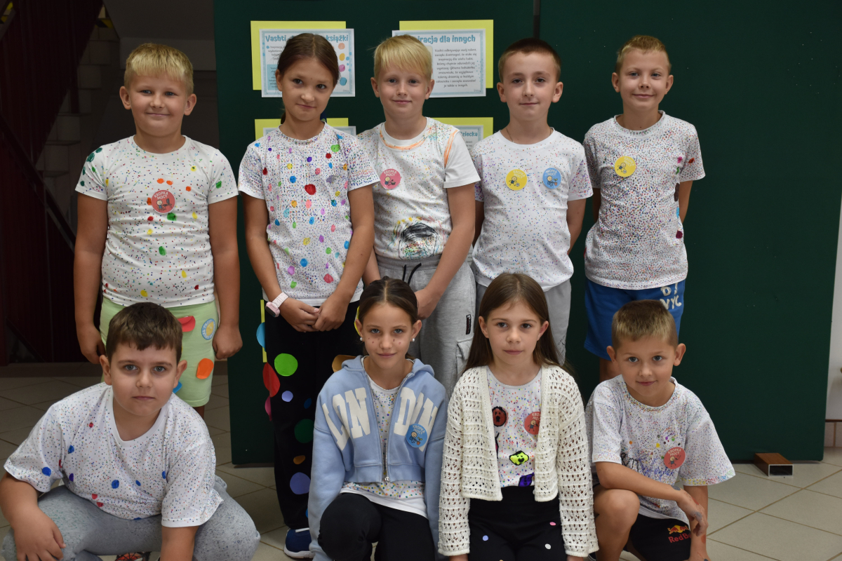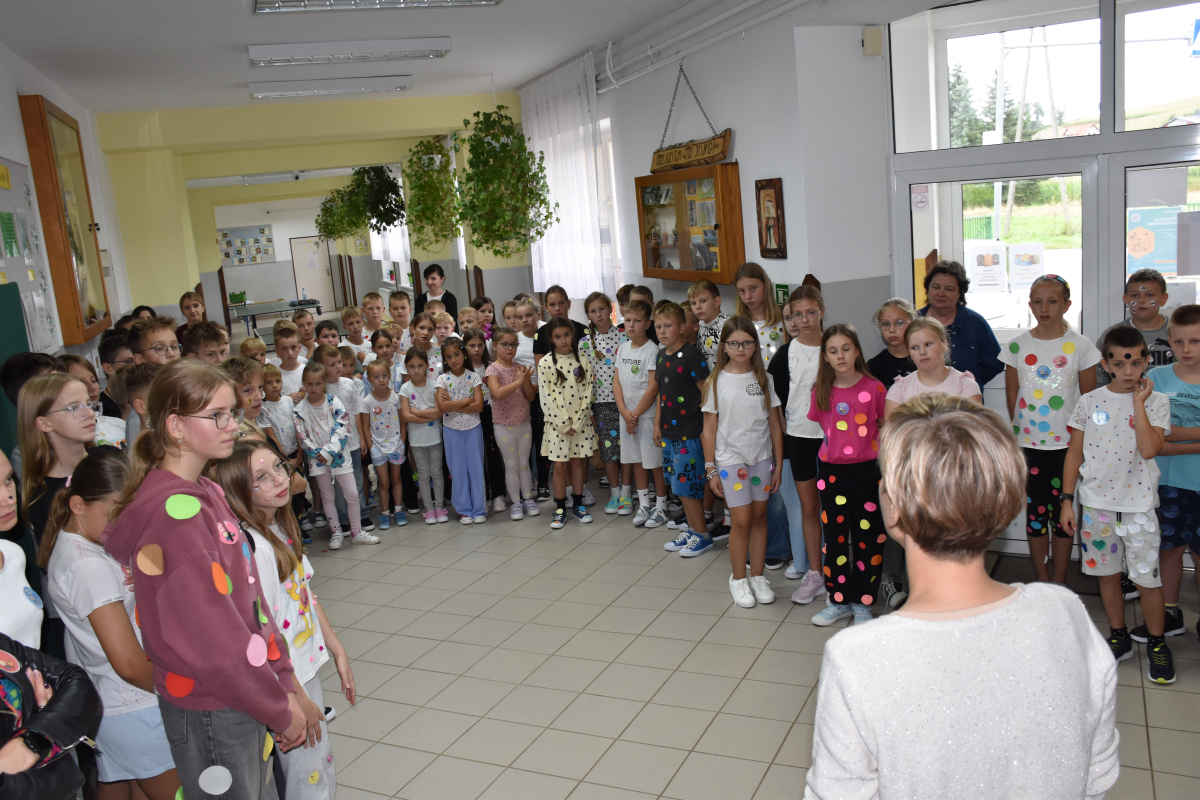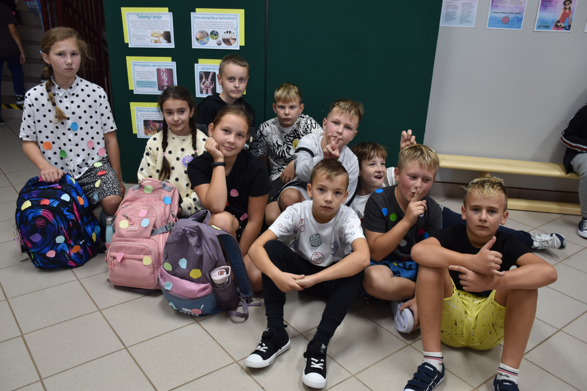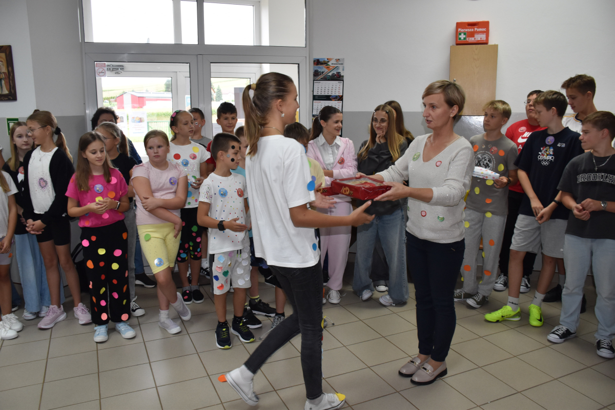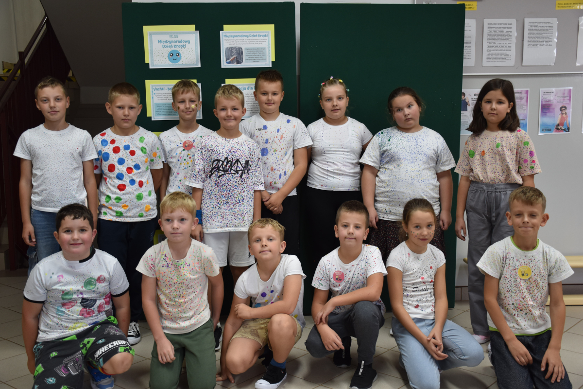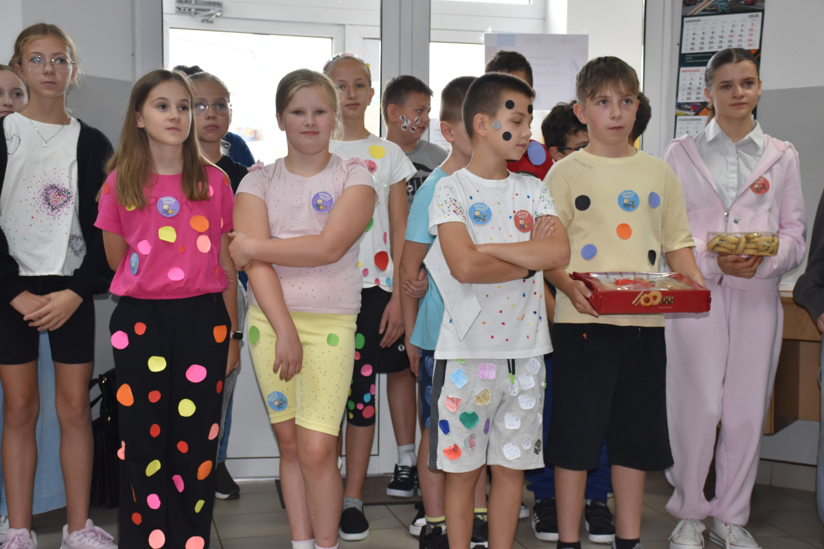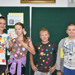 W piątek 19 września w naszej szkole Samorząd Uczniowski zorganizował obchody Międzynarodowego Dnia Kropki – Dzień Kropki Mocy. Celem tego wydarzenia było odkrywanie własnych talentów i zachęcanie do zaprezentowanie ich przed grupą. Inspiracją do stworzenia tego wydarzenia stała się Vashti, czyli bohaterka książki "The Dot"(autor: Peter H. Reyolds). Vashti nie wierzyła w swoje zdolności plastyczne. Jej nauczycielka plastyki wychwyciła talent dziewczynki malowanie pięknych kropek. Główna bohaterka - odpowiednio zmotywowana zaczęła malować nowe obrazki, a nawet tworzyć wystawy w galeriach sztuki! Vashti odkrywając swój talent, zaczęła dostrzegać, że stała się inspiracją dla wielu ludzi, którzy chętnie odwiedzili jej wystawę. Główna bohaterka zrozumiała, że wyjątkowe talenty drzemią w każdym człowieku i zaczęła zauważać je także u innych. W tym dniu uczniowie naszej szkoły zaprezentowali makijaże, stroje z elementami kropek. Z wielkim zaangażowaniem włączyli się do akcji. Najbardziej udekorowani uczniowie otrzymali bon zwalniający z odpowiedzi ustnej, ważny do końca września, natomiast klasy najbardziej wykropkowane otrzymały smakołyki. W tym dniu uczniowie mogli również zakupić przygotowane słodkości. Bardzo wszystkim dziękujemy za tak wielkie zaangażowanie i zachęcamy do udziału w kolejnych akcjach Samorządu Uczniowskiego!