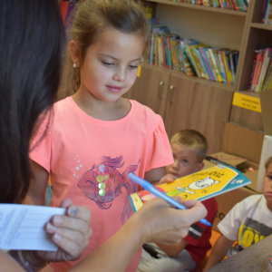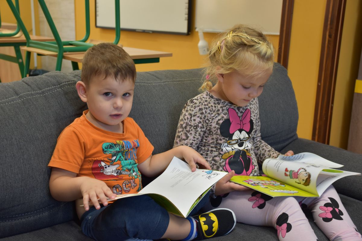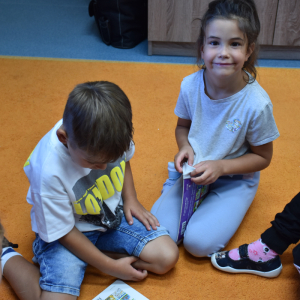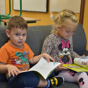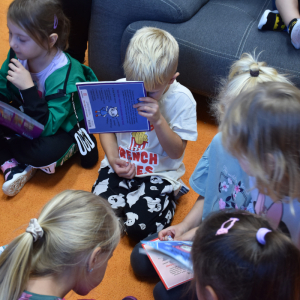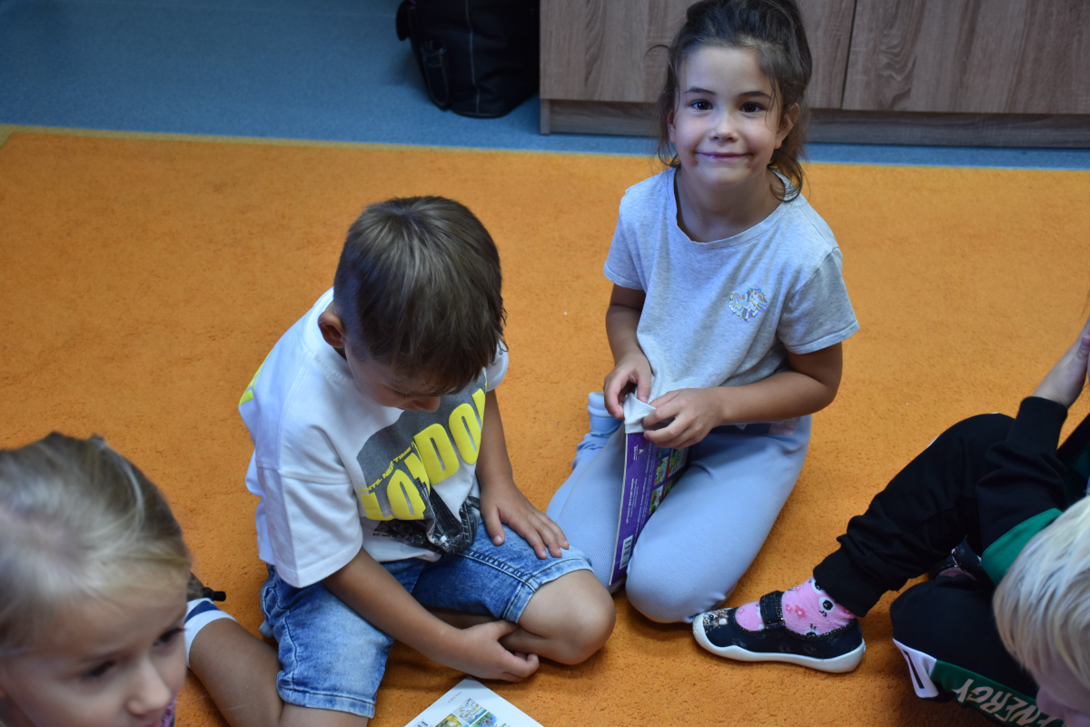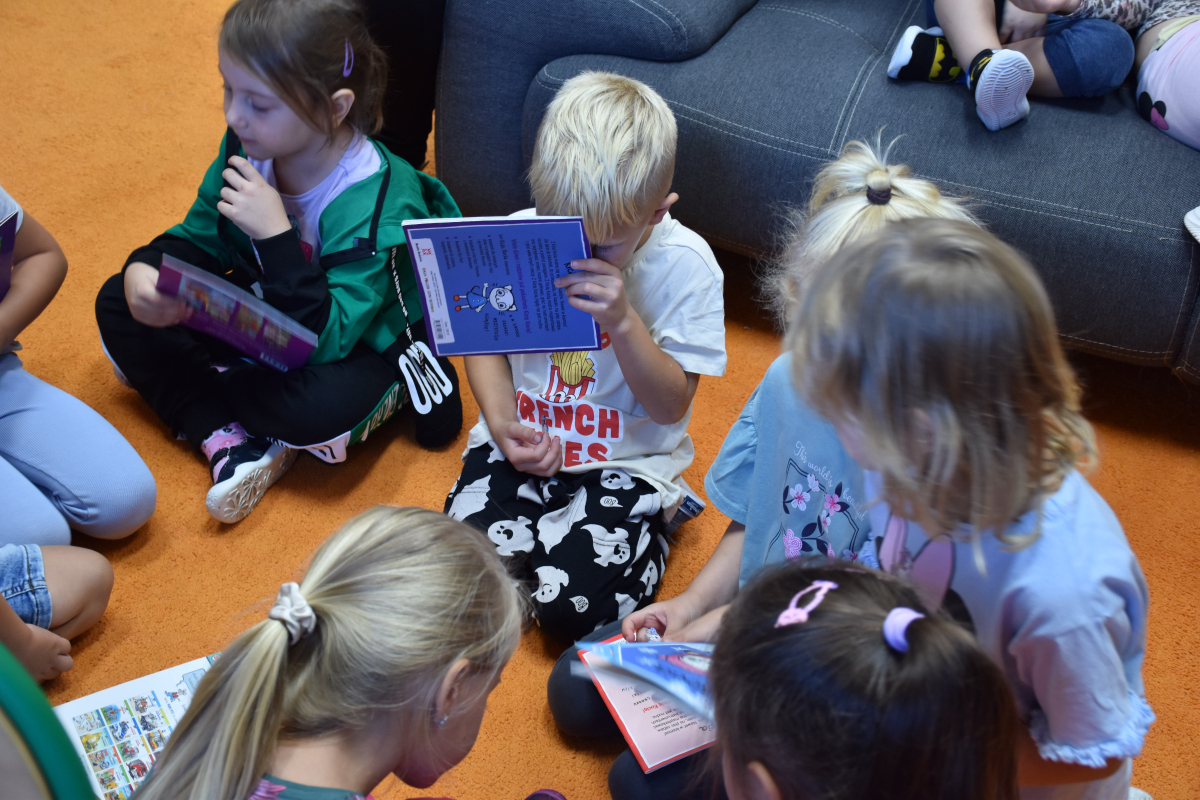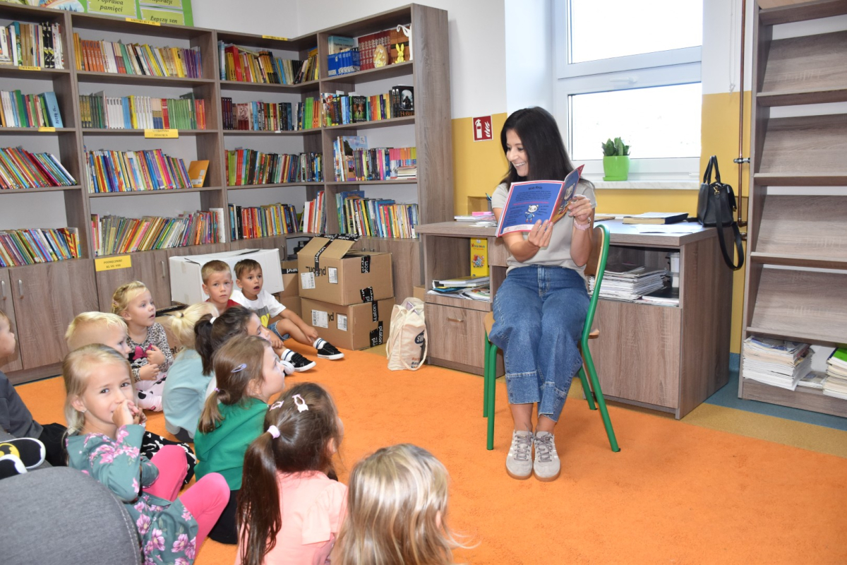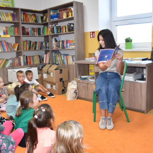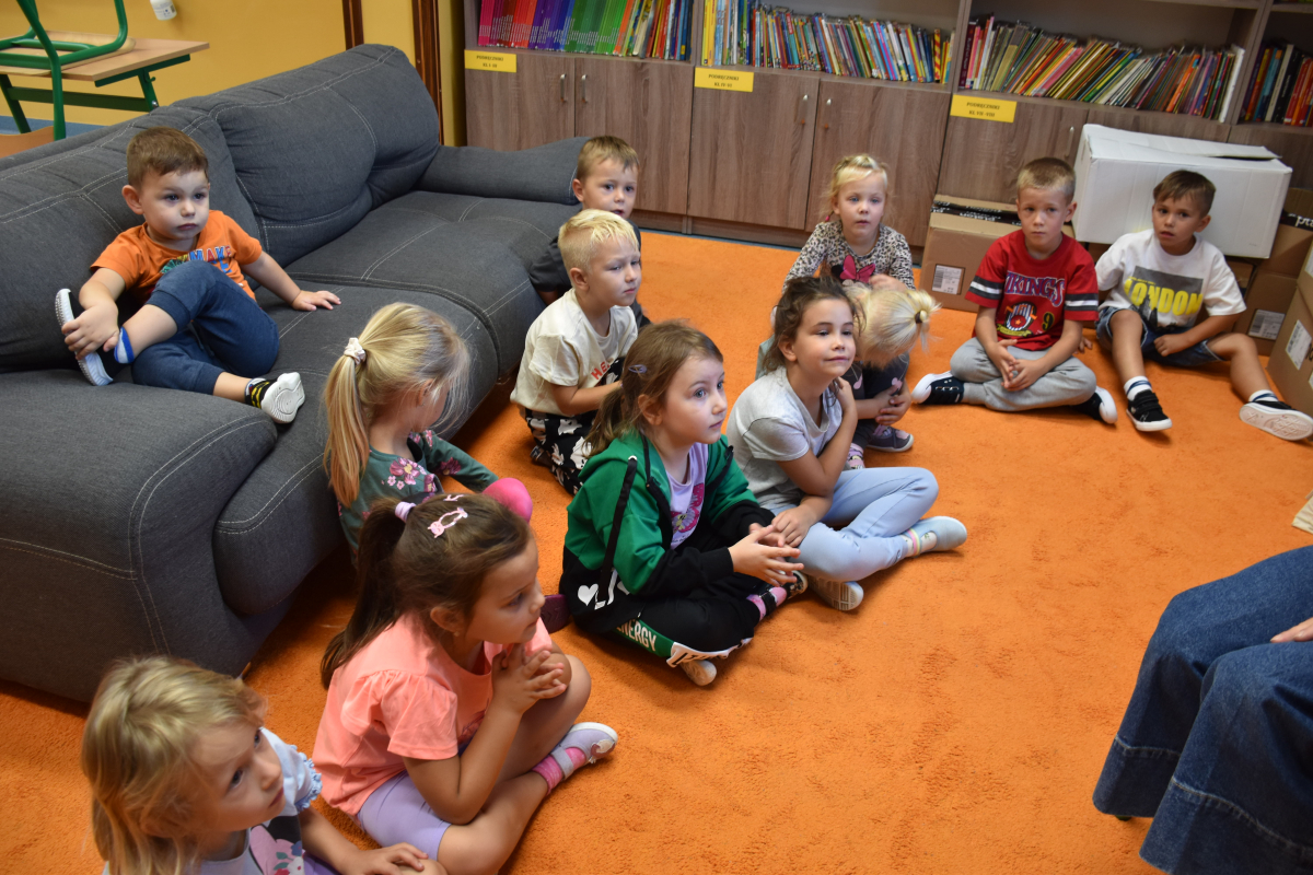 Dzieci z grupy przedszkolnej po raz pierwszy odwiedziły bibliotekę szkolną. Dla wielu z nich była to pierwsza wizyta w tym wyjątkowym miejscu. Na początek przedszkolaki wysłuchały bajki „Kicia Kocia w bibliotece”, dzięki której dowiedziały się, jak należy zachowywać się w bibliotece, dlaczego warto sięgać po książki oraz że trzeba o nie dbać. Podczas spotkania poznały podstawowe zasady korzystania z biblioteki i odkryły, że książki mogą być wspaniałymi towarzyszami zabawy i nauki. Największą atrakcją było samodzielne wypożyczenie pierwszej książki, każdy z małych czytelników wybrał coś dla siebie i z dumą zabrał do domu. Spotkania w bibliotece będą odbywały się co tydzień, aby najmłodsi mogli systematycznie rozwijać swoje zainteresowania czytelnicze i poznawać coraz to nowe historie.